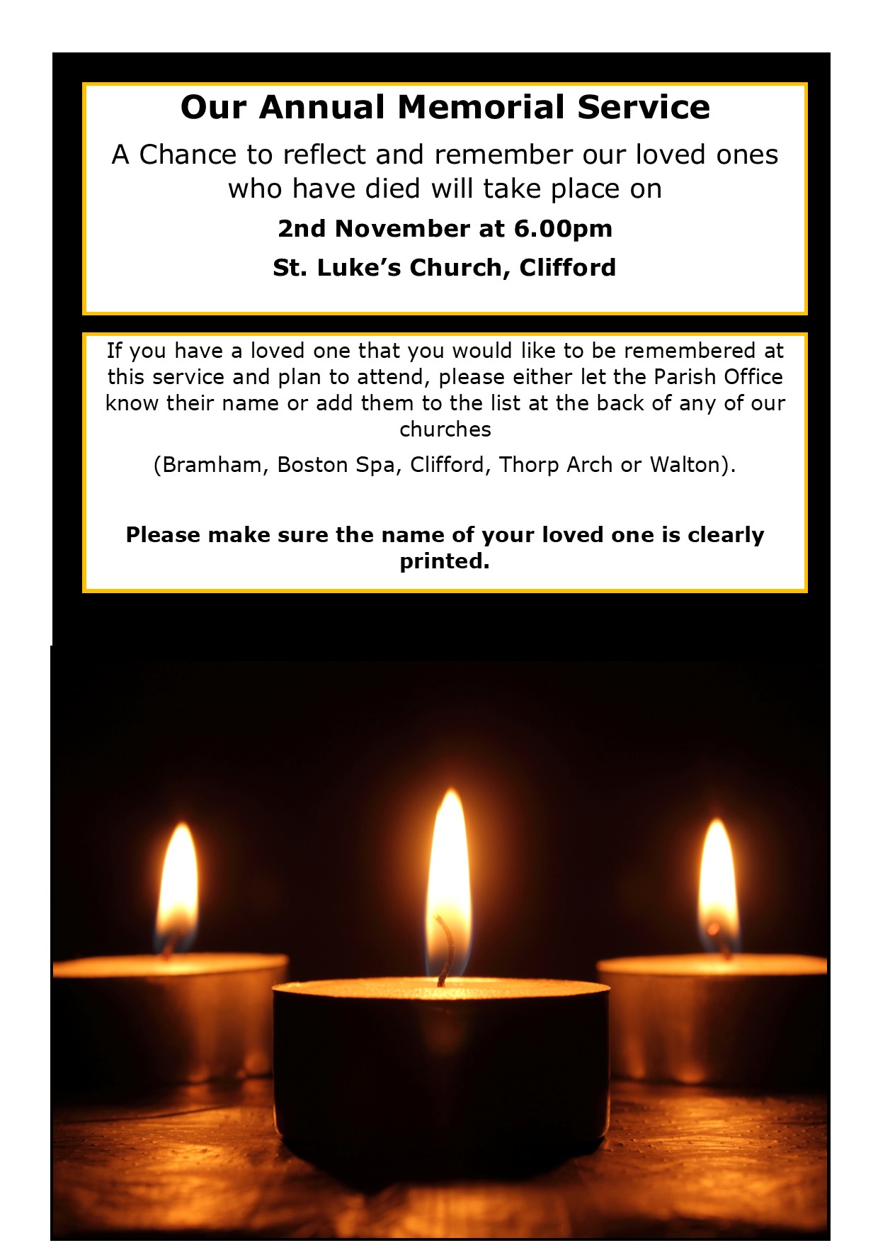 Annual Memorial Service at St. Luke’s Church, Clifford Memorial Service Poster 2025 + Add to Google Calendar + iCal / Outlook export Search for: Meta Log in Entries feed Comments feed WordPress.org