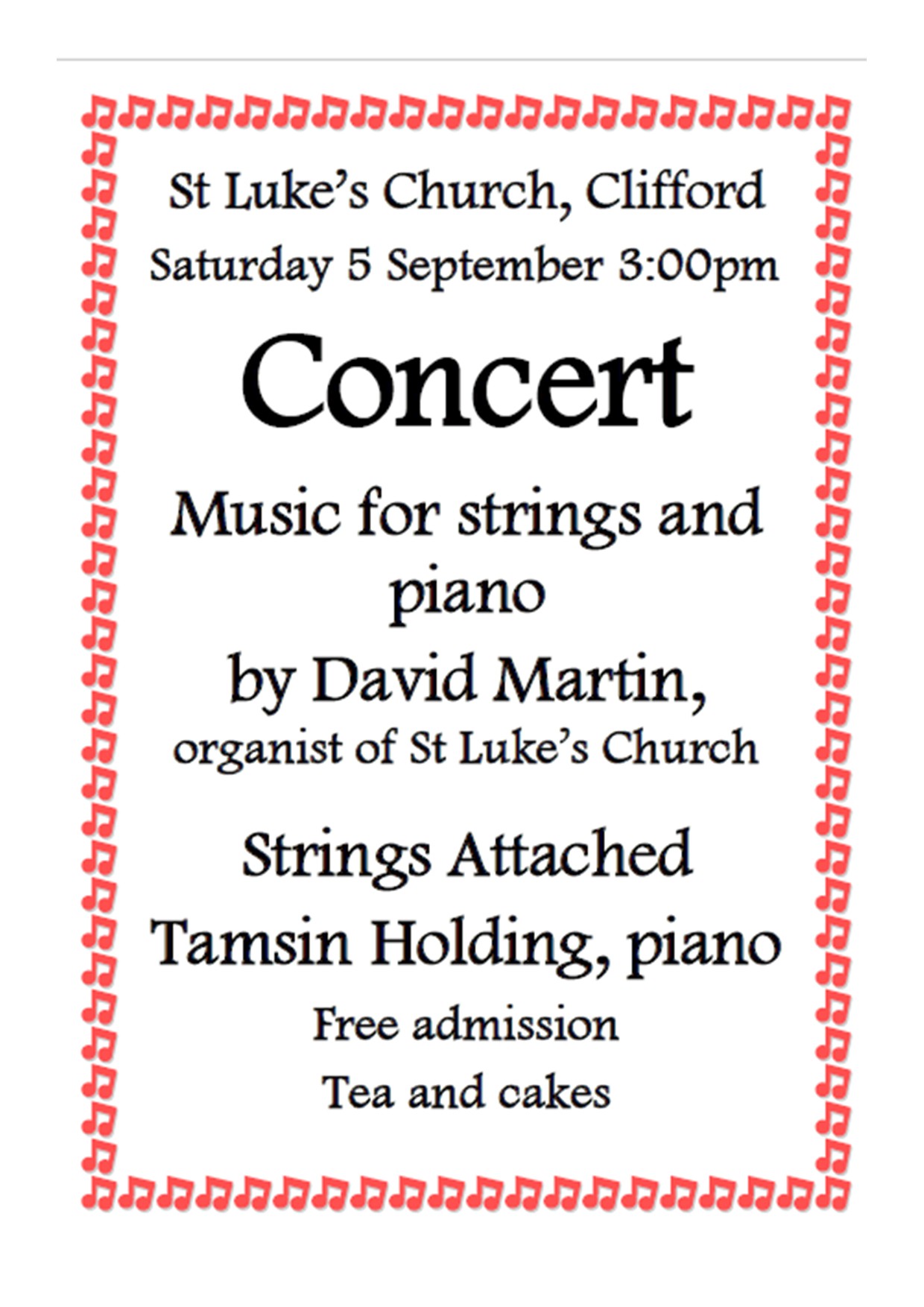 Concert – music for strings and piano at St Luke’s Church, Clifford St Luke's Concert 5 September 2026 + Add to Google Calendar + iCal / Outlook export 00 days 00 hours 00 minutes 00 seconds Search for: Meta Log in Entries feed Comments feed WordPress.org
